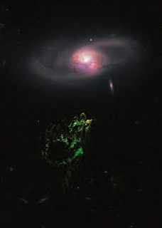 una galaxia–brillan con un característico color verde al estar iluminadas por