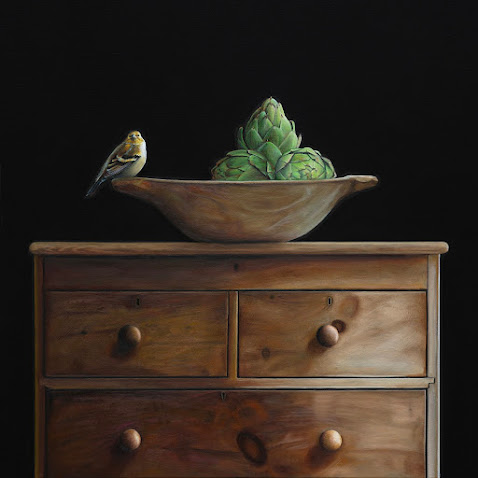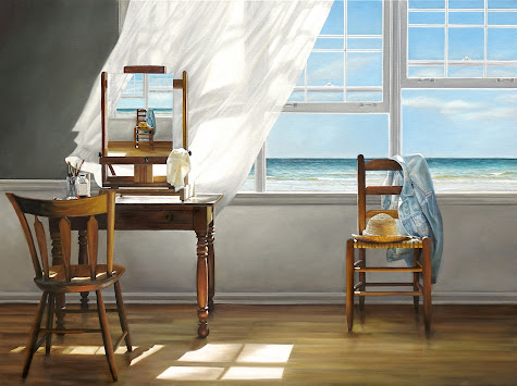 Karen Hollingsworth es conocida por sus composiciones de ensueño. A través de una cuidadosa selección de la artista a sus elementos «hablan» entre sí, y para el espectador, en formas únicas e inusuales. En muchos de sus espacios interiores pintados, se incluye ventanas abiertas que actúan como portales en un mundo imaginario. Estas «windowscapes», aireadas atraen a los espectadores con el movimiento implícito de aire entre un interior doméstico tranquilo y la belleza de los paisajes seductores (y las criaturas) que existen más allá de la ventana.