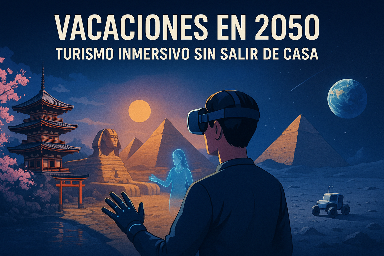 Hoy me he despertado temprano para aprovechar el día… o mejor dicho, los días. Mi plan es recorrer Japón, Egipto y la Luna en menos de 12 horas. No es que sea un viajero interdimensional, es que desde hace unos años contraté el «Plan Premium de Turismo Inmersivo«, un servicio que combina realidad aumentada, entornos hápticos, proyección sensorial y guías virtuales con IA. Vamos, que lo único que tienes que poner tú son las ganas (y la suscripción mensual).